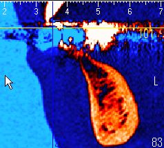 両側とも6,7番には十分な骨量があります。 左右1番の欠損部は水平的な骨量が不足しています。舌側に深く埋入すれば、骨内にインプラントを入れることができますが、残存歯とのポジションは大きくずれると考えられます。もしくは唇側に骨移植を行う方法も考えられます。