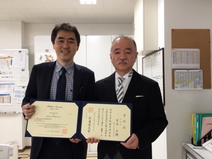 大学院卒業!! 2017.03.29 実は, 院長は密かに社会人大学院に通学する学生でした(^_^; 苦節5年,この3月にて無事学位を取得し,大学院を卒業しました. 今後は母校にて学生教育のお手伝いをしながら,まだ仕上がっていない研究の続きを行う予定です. 写真は,学位記をもらう院長と,式終了後ボスとの2ショットです.