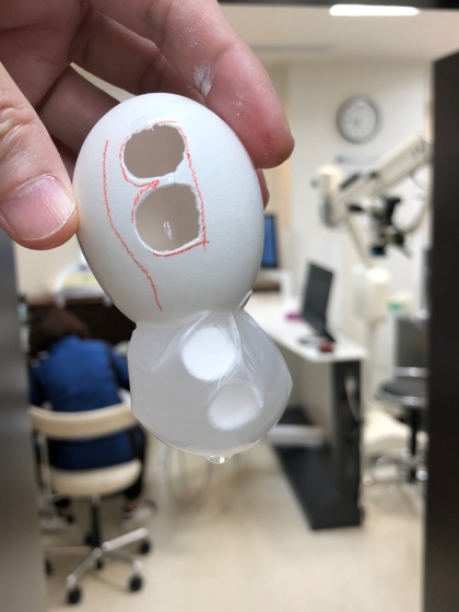 写真は卵の殻を骨に,薄膜を副鼻腔の粘膜に見立て,粘膜を破らずに剝離していく練習です.