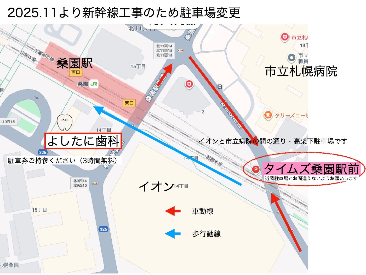 重要 2025.11.1より駐車場が変更になります 2025.10.07 北海道新幹線トンネル工事のため 今までの医院裏駐車場が2025.11.1より使用出来なくなります. 代替駐車場は,少し離れた市立札幌病院とイオンの間に位置する高架下駐車場「タイムズ桑園駅前」となります. 少し移動距離が長くなり,ご迷惑お掛けすることをお詫びします. 受診の患者様は駐車券を受付にお渡しください.3時間無料となります. 不明の点は受付までお問い合わせください.
